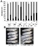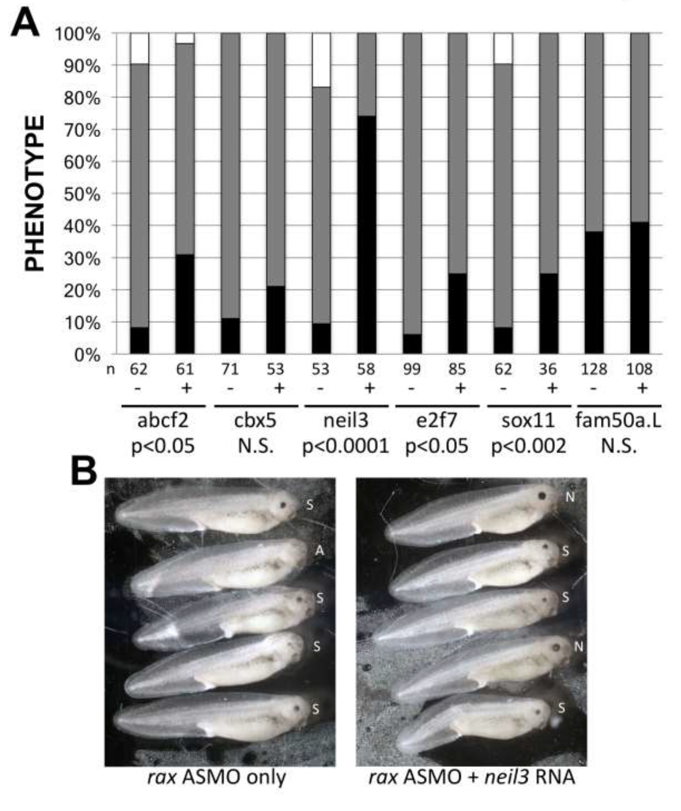 Figure 3 â Four of the genes identified in the microarray screen can significantly rescue the rax knockdown phenotype. X. laevis embryos were injected with rax antisense morpholino oligonucleotides (ASMO) with or without mRNA encoding each of the 6 microarray screen genes expressed in the CMZ (Figure 2). RNAs and lissamine-tagged MOs were injected into a dorsal blastomere at the 4-cell stage and embryos were screened for one-sided injection and normal, small, or absent eyes at st 41. A. Comparison of frequency of normal (black bar portion), small (gray bar portion), and absent (white bar portion) eye phenotypes in embryos injected with rax ASMO with or without RNAs encoding microarray genes (marked â+â or â-â, respectively, and identified at bottom of graph). Statistical significance of rescue was determined (studentâs t-test performed using frequency of normal eyes in RNA injected vs uninjected samples); p-values are shown at the bottom of the graph. N.S. = not significant (p>0.05). Number of embryos for each condition (n) is shown below each column. B. Sampling of embryos injected with rax ASMO with or without neil3 RNA (right and left panels, respectively). Embryos were injected with lissamine-tagged rax ASMO with or without neil3 RNA. Shown are injected sides of st 41 embryos scored as having normal (N), small (S), or an absent (A) eye.