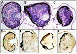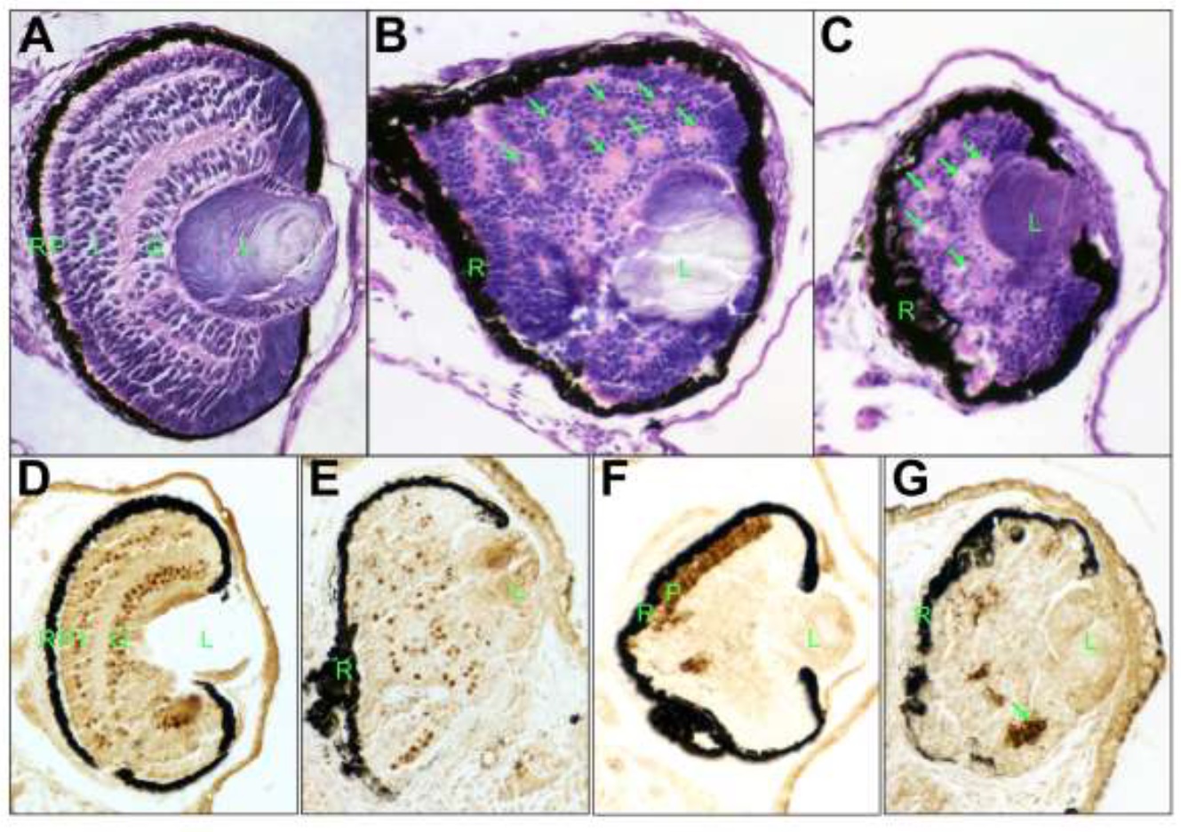 Figure 5 â neil3 knockdown embryos exhibit deficits in retinal development. A â C. Knockdown of neil3 results in a disorganized retina. Histological staining of retinas from uninjected (A) or injected (B,C) sides of embryos injected with neil3 antisense morpholino oligonucleotide (ASMO), sectioned, and stained with hemotoxylin/eosin. D â F. Knockdown of neil3 results in aberrant retinal cell differentiation. Embryos injected with neil3 ASMO were fixed and subjected to immunohistochemistry using antibodies against Islet-1 (D,E) or rhodopsin (F,G). Panels D and F show uninjected side and E and G show injected sides. R â retinal pigmented epithelium (RPE); P â photoreceptor layer; I â inner nuclear layer (INL), G â ganglion cell layer; L â lens. Arrows indicate examples of putative photoreceptor rosettes.