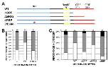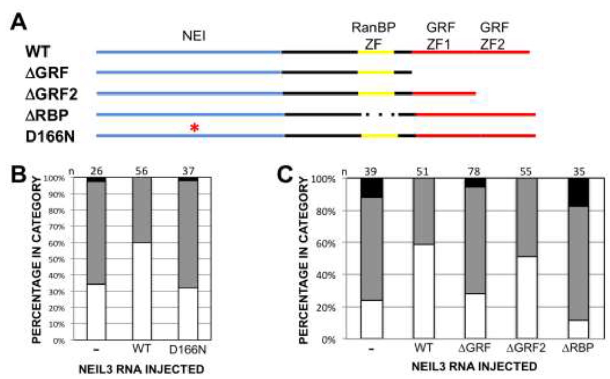 Figure 7 â Stereotypical peptide domains are required for neil3 function. A. Diagram of neil3 protein highlighting stereotypical peptide domains: NEI domain (blue), RanBP-type zinc finger (yellow), and GRF-type zinc fingers (red). Wild type (top line) and mutated versions are depicted. ïGRF: both GRF zinc fingers deleted; ïGRF2: second GRF zinc finger deleted; ïRBP: RanBP zinc finger deleted; D166N: point mutation resulting in aspartate 166 substitution by asparagine. B,C. RNA encoding neil3 containing the D166N mutation (B) or deletions of RanBP- or GRF-type zinc fingers (C) does not rescue the rax knockdown phenotype to the same extent as wild type neil3. Open/white portion of graph bar: normal eye; gray: microphthalmia; black: anophthalmia. X. laevis embryos were injected with rax antisense morpholino oligonucleotides (ASMO) alone or with mRNA encoding wild type or nutated neil3. RNAs and lissamine-tagged MOs were injected into a dorsal blastomere at the 4-cell stage and embryos were screened for one-sided injection and normal, small, or absent eyes at st 41. Number of embryos for each condition (n) is shown below each column in B and C.
