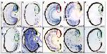 Figure 2 â Six of the genes identified in the microarray screen are expressed in the ciliary marginal zone. Fixed X. laevis tadpoles (st 41) were paraffinized, sectioned and subjected to in situ hybridization using antisense riboprobes for the 10 genes expressed in the eye (see Figure 1). Genes/riboprobes are identified in the lower left of each panel. Sections are presented with dorsal side towards the top of the figure. The dorsal CMZ is indicated with an oval. Key: green â positive expression in CMZ; red â negative expression in CMZ; yellow â positive expression in CMZ and ubiquitous expression in retina. L â lens.
