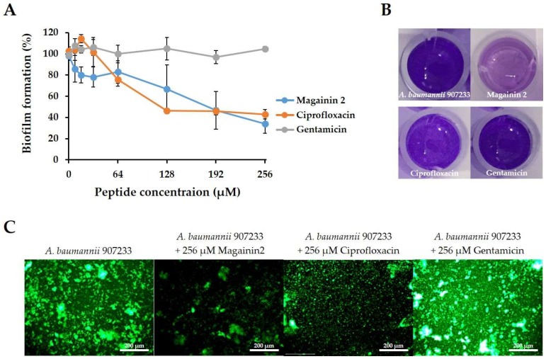 Figure 6. Biofilm reduction assay. (A) Degree of biofilm removal by magainin 2, ciprofloxacin, and gentamicin using crystal violet staining. (B) Image of removed biofilm after treatment with 256 µM of peptide and antibiotics. (C) SYTO9-stained biofilm image.