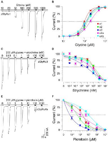 Figure 4. zGlyRα subunits form functional homomeric receptors that are activated by glycine, and inhibited by strychnine and picrotoxin. (A) Two-electrode voltage-clamp recording from an oocyte injected with five femtomoles of zGlyRα1 cRNA exposed to serial application of glycine of increasing amount. Ten oocytes were used for each assay. (B) Cumulative dose-response relationship of glycine-evoked currents. The amplitude of each glycine-evoked response was normalized to the maximally-evoked current for each oocyte (n = 10). Values here and elsewhere represent the average ± SEM. Dashed line denotes EC50. (C,E) Recordings from oocytes exposed to glycine and increasing amounts of strychnine or picrotoxin, respectively (n = 10). (D,F) Cumulative dose-response relationships of strychnine and picrotoxin-blocked currents (n = 10). Extent of blockade was normalized to the current amplitude evoked by 200 μM glycine in each oocyte. Dashed lines denote IC50s.