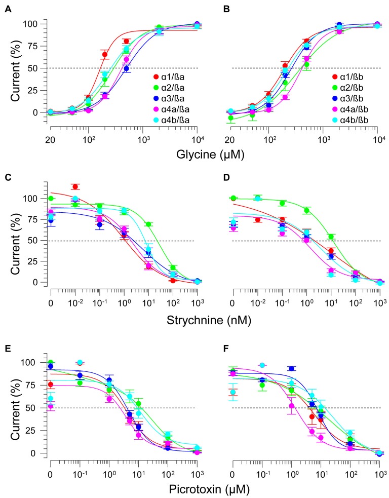 Figure 5. zGlyRß subunits form functional heteromeric receptors with zGlyRα subunits. Cumulative dose-response relationships of glycine-evoked currents from oocytes co-injected with 2.5 femtomoles of zGlyRα cRNA and 2.5 femtomoles of either zGlyRßa (A) or zGlyRßb (B) cRNA. Ten oocytes were used for each assay. (C–F) Cumulative dose-response relationships of strychnine and picrotoxin-blocked currents from heteromeric zGlyRs. Ten oocytes were used for each assay.