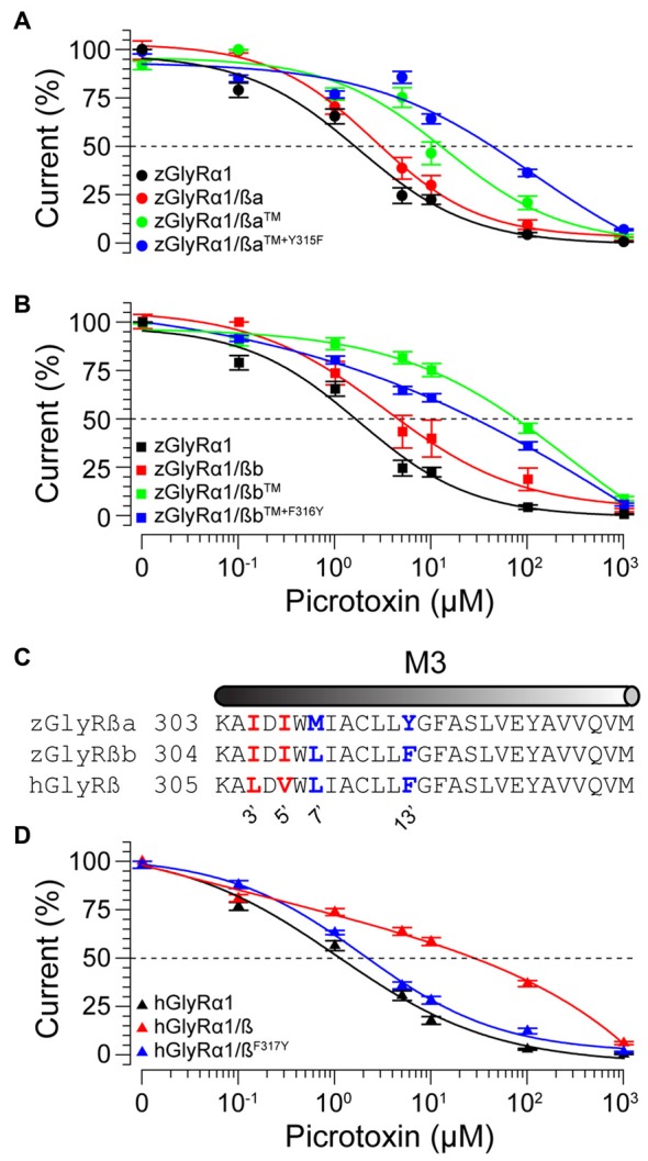 Figure 6. Residues within M2 and M3 of zebrafish and human ß subunits contribute to picrotoxin resistance. Cumulative effect of amino acid substitutions on picrotoxin-mediated blockade of zGlyRßa (A), zGlyRßb (B), and hGlyRß containing receptors (D). TM: triple mutation of residues in M2 of zGlyRß subunits; ßa: L280F+S286A+S291T, ßb: L281F+S287A+S292T. Ten oocytes were used for each assay. (C) Sequence alignments of M3 from hGlyRß and zGlyRß subunits. Red and blue letters indicate residues that are conserved between zGlyRß subunits, and zGlyRßb and hGlyRß, respectively.