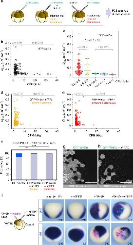 Fig. 6. Expansion of Wnt3a distribution range by expression of sFRP2 in Xenopus embryos. aâf Fluorescence Correlation Spectroscopy (FCS) analysis of GFP-Wnt3a. Schematic representation of the FCS analyses is presented (a). GFP-Wnt3a mRNA was injected into a blastomere (b, c), and GFP-Wnt3a and sFRP2 mRNAs were injected into the same blastomere (d) or into different blastomeres (e) in Xenopus eggs at the 4-cell stage, and then the extracellular milieu within almost one-cell diameter from Wnt3a-expressing cells was analyzed by FCS at the mid-gastrula stage. CPM and Dslow measured in each time period (10âseconds) are plotted (b, d, e). Distribution of Dslow values shown in (b) is indicated in increments of 3.5 CPM (c). The pattern of distribution of Dslow was clearly divided at 7.0 CPM. Statistical significance (p) was calculated by using the Wilcoxon rank sum test. Summarized representation of the high and low CPM populations is also shown (f). Multiple comparisons using Bonferroni correction were performed with Fisherâs exact test (two-sided; ***pâ<â0.001). g, h Distribution of GFP-Wnt3a in the absence (nâ=â4; (g)) or presence (nâ=â4; (h)) of sFRP2 expression. GFP-Wnt3a and sFRP2 mRNAs were injected into different blastomeres in Xenopus embryos at the 4-cell stage, and the distribution of GFP-Wnt3a was determined by GFP-Fluorescence at stage 10.5. The distribution range of GFP-Wnt3a was expanded in the presence of sFRP2. The scale bars in (g), (h) represent 100âμm. i Expansion of the signaling range of Wnt3a by sFRP2. Wnt3a was expressed by injecting a DNA expression construct (pCS2â+âWnt3a, 8.25âpg/embryo) to avoid affecting the early Wnt signaling involved in the dorsal determination, together with nβ-gal (pCS2â+ânβ-gal, 100âpg/embryo). sFRP2 mRNA (1âpg/embryo) was injected in the blastomere diagonal to the Wnt3a-injected one, as illustrated. Wnt3a source cells were stained in magenta. In situ hybridization of Wnt target genes, gbx2 or otx2, was examined in st. 12 Xenopus embryos. Double-headed arrows indicate expansion of Wnt3a effect on gbx2 activation or otx2 inhibition. Representative images are presented (numbers of embryos with similar staining patterns/total embryos examined are as indicated at the right bottom of panels) |