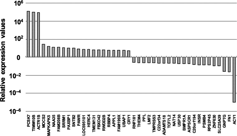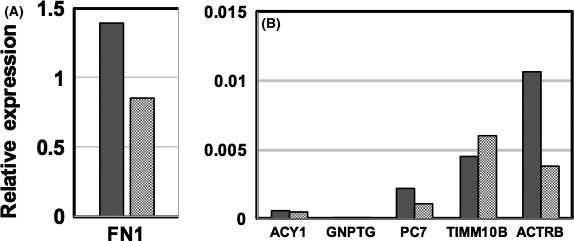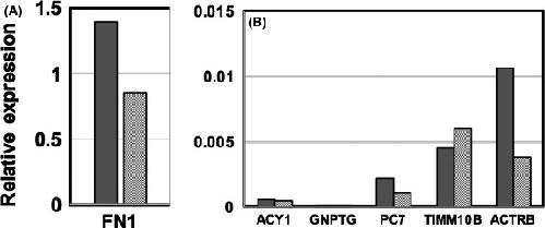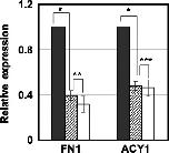 RTâPCR of the candidate transcripts in HUVECKi2 affected by GOâY078. Relative expression values of the basal levels (closed bars) and those of the treated levels with 0.5 μmol/L GOâY078 (shaded bars) are indicated. A, fibronectin 1 (FN1); B, other candidates