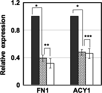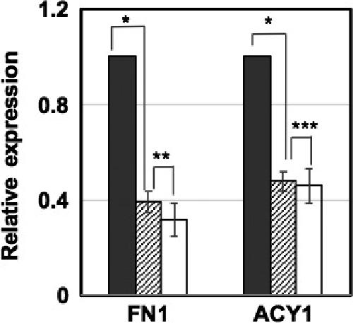 Figure 5. Doseâdependent inhibition of fibronectin 1 (FN1) by GOâY078. Relative expression values of the Mock (indicated by closed bars) and those of the treated levels with 0.5 μmol/L (shaded bars) and 1.0 μmol/L GOâY078 (open bars) are indicated. *P < .001, **P < .05. ***no significance