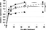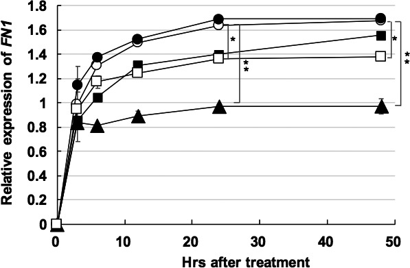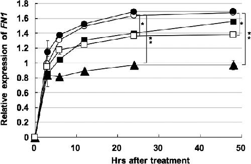 Figure 6. Kinetic inhibition of fibronectin 1 (FN1) in HUVECKi2. Relative amount of fibronectin is indicated at each time (h) after treatment. HUVECKi2 was treated with 0.5 μmol/L GOâY078 (closed rectangle), 1.0 μmol/L GOâY078 (closed triangle), 1.0 μmol/L sorafenib (closed circle), and 1.0 μmol/L sunitinib (open rectangle). Mock is indicated by open circle. *P < .05, **P < .001