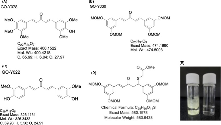 Figure 1. Chemical structures of diarylpentanoid curcumin analogs. A, GO‐Y078; B, GO‐Y030; C, GO‐Y022; D, GO‐Y136; E, Appearance of 30 mg GO‐Y030 (left) and GO‐Y136 (right) in PBS
