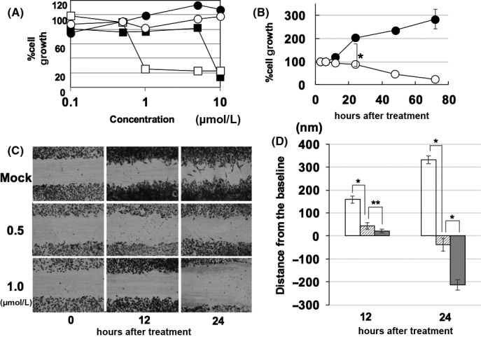 Figure 2. Effect of GO‐Y078 on HUVEC resistant to angiogenesis inhibitors. A, Growth inhibition of HUVECKi2 with GO‐078 (open rectangle), sorafenib (closed rectangle), sunitinib (closed circle), and Ki8751 (open circle). B, Growth property of HUVECKi2 without (closed circle) and with 1.0 μmol/L GO‐Y078 (open circle). *P < .001. C, Wound healing assay of HUVECKi2 with GO‐Y078. D, Graphical view of the inhibition of the mobility of HUVECKi2. Open, shaded, and closed bars indicate treatments with mock, 0.5 μmol/L, and 1.0 μmol/L, respectively. *P < .001, **no significance