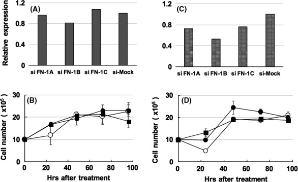 mRNA in the suspended HUVECKi2. D, Effects of the growth of the suspended HUVECKi2 treated with the FN1âSiâoligo (open circle), controlâSiâoligo (closed rectangle), and without Siâoligo (closed circle)