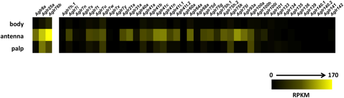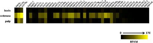 Figure 1. AgIr transcript abundances in adult appendages and larval heads.Heat map depicting abundances of An. gambiae variant ionotropic receptors (AgIrs) in adult chemosensory tissues (data adapted from28). Scale color intensity indicates Reads Per Kilobase per Million reads (RPKM).