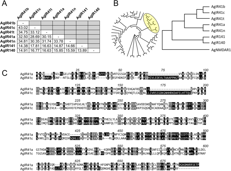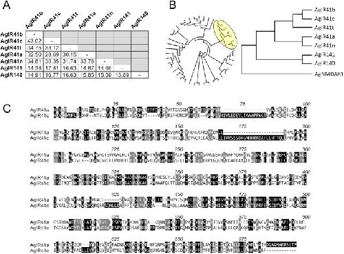 Figure 3. Phylogenetic relationships among AgIR41-related receptors.(A) Pairwise amino acid percent identity matrix. (B) Cladograms based on sequence alignments of all AgIRs (circular cladogram) with AgIR41 clade (yellow circle) shown using the N-Methyl-D-Aspartate Receptor 1 (AgNMDAR1) as an outgroup. (C) Alignment of AgIR41a and AgIR41c amino acid sequences using the single letter code. Identical residues are indicated with black boxes over white text. Similar residues are shaded with gray boxes. Numbering indicates aligned positions, including gaps.