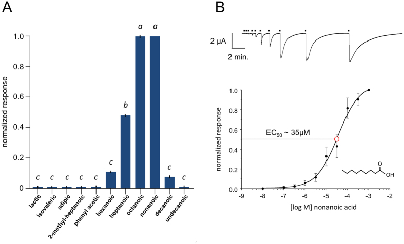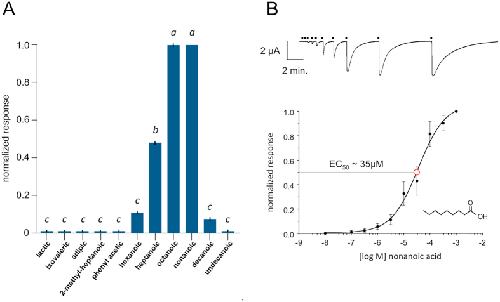 Figure 6. Functional analysis of the AgIR75k complex in Xenopus laevis oocytes.(A) cRNA encoding AgIr75k (co-injected with AgIr8a) elicits chemically-evoked inward currents in response to short chain carboxylic acids. Bars indicate mean normalized responses (+/− SEM) for each compound [10−4 M] compared with the maximum response to nonanoic acid. Lower case letters indicate significant differences among mean responses (P < 0.01 for all comparisons). n = 13 oocytes per trial. (B) Concentration-response profiles of the AgIR75k complex in response to nonanoic (closed circles) plotted on a log scale. EC50 value (open red circle) is shown. Each data point represents the mean+/− SD (bars). Representative TEVC trace showing inward current responses to increasing concentrations of nonanoic acid for the AgIR75k complex (top). n = 8 oocytes each.