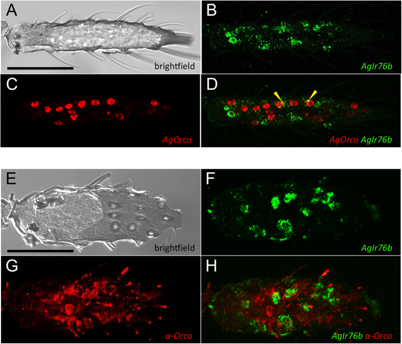 Figure 2. Expression of AgIr76b and AgOrco in An. gambiae antennae.(A–D) Double in situ hybridization using antisense RNA probes showing transcript localizations for the co-receptors AgIr76b (green) and AgOrco (red) are localized within distinct cells within adult female antennae. Yellow arrowheads indicate areas of overlap between green and red signals, due to spatial proximity of distinct cells. (E–H) In situ hybridization using an AgIr76b antisense RNA probe (green) plus immunohistochemical localization of AgOrco using an anti-Orco antibody (red). Scale bars ~50 μm.
