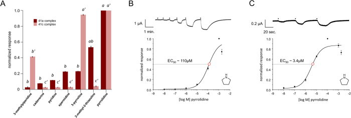 Figure 4. Functional analysis of AgIR41a and AgIR41c complexes in Xenopus laevis oocytes.(A) cRNAs encoding AgIr41a or AgIr41c (co-injected with AgIr25a and AgIr76b) elicit distinct profiles of chemically-evoked inward currents. Bars indicate mean normalized responses (+/− SEM) for each compound [10−4 M] compared with the maximum response to pyrrolidine. Lower case letters indicate significant differences among mean responses (41a complex, P < 0.03 for all comparisons; 41c complex, P < 0.01 for a’-b’ and a’-c’ comparisons, P < 0.07 for b’-c’ comparisons). n = 4 oocytes per trial. (B,C) Concentration-response profiles of AgIR41a (B) or AgIR41c (C) complexes in response to pyrrolidine (closed circles) plotted on log scales. EC50 values (open red circles) are shown. Each data point represents the mean+/− SD (bars). Mean EC50 values are significantly different (t-test; P < 0.001). Representative TEVC traces showing inward current responses to increasing concentrations of pyrrolidine for each AgIR complex (top). n = 4 oocytes each.