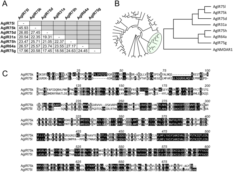 Figure 5. Phylogenetic relationships among AgIR75-related receptors.(A) Pairwise amino acid percent identity matrix. (B) Cladograms based on sequence alignments of all AgIRs (circular cladogram) with AgIR75 clade (green) shown using the N-Methyl-D-Aspartate Receptor 1 (AgNMDAR1) as an outgroup. (C) Alignment of AgIR75k and AgIR75l amino acid sequences using the single letter code. Identical residues are indicated with black boxes over white text. Similar residues are shaded with gray boxes. Numbering indicates aligned positions, including gaps.