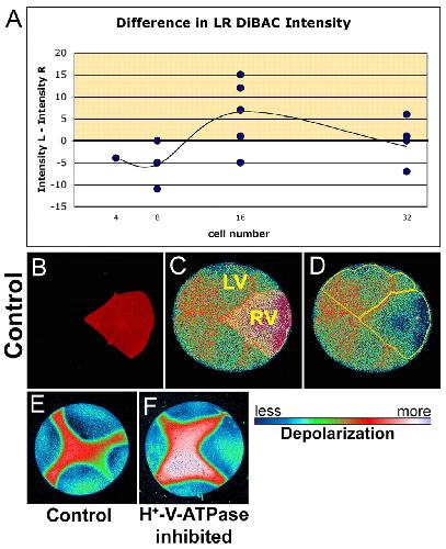 Fig. 4. DiBAC staining reveals the Vmem pattern of blastomere membranes under normal conditions and in H+-V-ATPase inhibitor. (A) Graph showing the difference in DiBAC intensity on the left versus the right ventral quadrants of the embryo. Positive values (yellow) indicate that the right side is hyperpolarized with respect to the left side; negative values indicate the inverse. At the 16-cell stage, the right side is hyperpolarized with respect to the left. (B-D) Example of DiBAC-stained 16-cell embryo; DiBAC4(3) intensity on the left was greater than on the right. Fluorescence intensity in C and D is pseudocolored; LUT shown below. (B) Alexa 647-10,000 Mr dextran (Molecular Probes) lineage labeled the right ventral quadrant. (C) Background-corrected maximum-projected series of confocal images of DiBAC fluorescence overlaid with lineage label to show location of left ventral (LV) and right ventral (RV) quadrants and the position of the ventral midline (between). (D) Regions of interest outlined in yellow. Mean pixel intensities in these two regions were used as measures of depolarization of cells on the two sides of the embryo. The difference between these two mean intensities was calculated to produce data in A. (E,F) DiBAC4(3) fluorescence from a four-cell embryo; (E) untreated and (F) treated with concanamycin. Consistent with the prediction that inhibiting the H+-V-ATPase will cause cells to depolarize (as H+ builds up inside the membrane), concanamycin causes an increase in DiBAC4(3) fluorescence intensity visible here as the larger area of red and the area of white to lavender. |