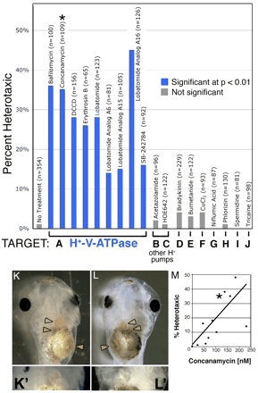 Fig. 1. Heterotaxia induced by H+-V-ATPase inhibitors. Xenopus embryos were soaked in inhibitors of various ion transporters. The percent of embryos considered heterotaxic (defined as a reversal of at least one from the heart, gut or gall bladder) is calculated relative to the total number of embryos, most of which showed normal laterality. Inhibitors of H+-V-ATPase (A) caused significant levels of heterotaxia, while inhibitors of other proton pumps (B,C) or of other transporters (D-J) had no effect on laterality. Inhibitor names and sample sizes are listed above the bars; targets and doses of drugs in B-J are listed in Table 1. Complete randomization of three organs would lead to a maximum heterotaxia rate of 87.5%, as, by chance, organ situs will appear to be wild type in 12.5% of embryos. (K) A wild-type embryo, ventral view, showing the normal arrangement of the gut (yellow arrowhead), heart apex (pink arrowhead) and gall bladder (green arrowhead). (K') Higher magnification of normal heart. (L) A heterotaxic embryo (ventral view) showing reversal of all three organs, i.e. situs inversus. (L') Close-up of reversed heart. Image contrast has been enhanced for clarity, and the loop of the heart has been outlined with black dots in K and L. Drugs used for this screen were titered to determine a dose that will cause heterotaxia without causing other morphological defects; (M) an example titration curve for concanamycin. The asterisk in M corresponds to the datum used in A (115 nM). There is a degree of variability among sensitivity of embryos obtained from different females; toxicity (defined as the percent of embryos dying post-gastrulation and/or developing with significant morphological defects) increases at larger concentrations, and there is only a narrow range of useful doses. The dose that is toxic to 50% of embryos (TD50; corrected for control background lethality of 9%) was 234 nM. |
