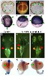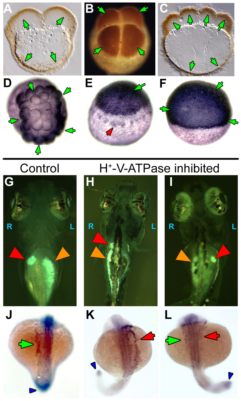 Fig. 7. H+-V-ATPase subunits and heterotaxia in zebrafish. (A-F) Immunohistochemistry for H+-V-ATPase subunits in zebrafish embryos: (A) subunit F in a two-cell embryo; (B) subunit c in a four-cell embryo; (C) subunit F in an eight-cell embryo. Brown (HRP-conjugated secondary) indicates a positive signal. At these stages, the cortical cytoplasm of all cells is positive for these two subunits, as is the cortical cytoplasm of the yolk cell. (D) Thirty-two-cell zebrafish embryo stained for subunit c. Staining (blue, AP-conjugated secondary) is heaviest in the marginal cells of this stage, but present in all cells. (E) Early in epiboly, subunit c staining is dark in the cells of the spreading blastoderm. In addition, staining is visible around a ring of yolk syncitial nuclei, probably representing vesicle staining (red arrowhead). (F) Once epiboly is more than 50% complete, immunohistochemistry for subunit c shows an even and heavy distribution in all the cells of the blastoderm. The antibodies used in this figure did not work in western blots on chick and fish extracts. (G-I) Heterotaxia in zebrafish larvae. Tricaine-anaesthetized 5- to 6-day larvae were examined on a Zeiss StemiSV11 dissecting microscope under 488/40 nm illumination, using a 510 nm barrier filter. An embryo was considered heterotaxic if either pancreas (orange arrowheads), gall bladder (red arrowheads) or both organs were on the side opposite normal. (G) Normal position of gall bladder (right) and pancreas (left). (H) Heterotaxia involving the pancreas. (I) Heterotaxia involving both organs. When scoring two organs, the top heterotaxia rate is 75% as, by chance, organ situs will appear to be wild type in 25% of fully randomized embryos. (J-L) Whole-mount in situ hybridization for the nodal-related gene southpaw (Spaw), which is expressed in the left lateral plate mesoderm (LPM) and tailbud of wild-type embryos from approximately 15-somite to 22-somite stage. (J) Untreated embryos at 20-22-somite stages showed wild-type Spaw expression in the left LPM (green arrow). Spaw expression in the tail bud (an internal positive control for the specificity of the treatment on Spaw asymmetry) is indicated by a blue arrowhead. Similarly staged embryos treated early with the H+-V-ATPase inhibitor lobatomide A16 exhibited reversed (K, red arrow) and bilateral (L, green and red arrows) Spaw expression (Long et al., 2003). See Table 5 for statistical analysis. |