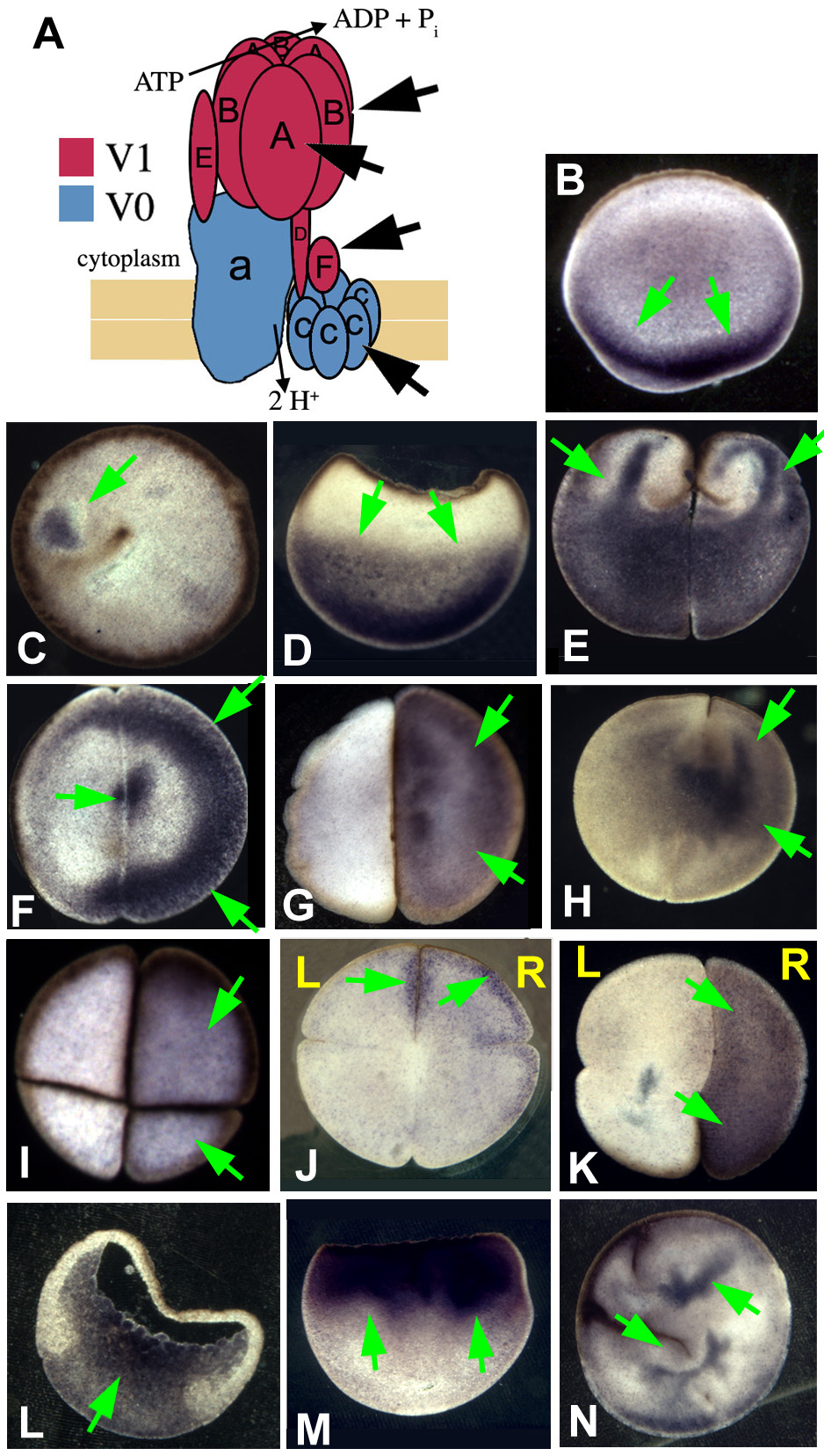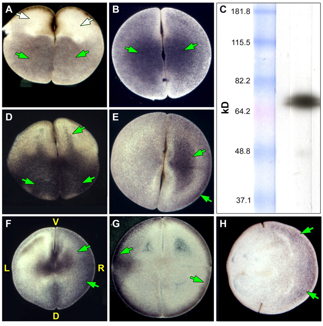 Fig. 3. Immunohistochemistry of H+-V-ATPase subunit A. Immunohistochemistry with an alkaline phosphatase conjugated secondary antibody for subunit A of the H+-V-ATPase. Embryos were oriented based on pigmentation and cleavage patterns - a technique that consistently reveals biased asymmetry among the L and R blastomeres with respect to a number of properties (Fukumoto et al., 2005b). Positive signals are blue to purple; LR orientation of embryos is only possible in four- and eight-cell embryos. (A) The molecular motor (Gross et al., 2002) myosin V (AV section i.e. parallel to AV axis) and (B) the ciliary protein (Bonnafe et al., 2004) RFX3 (flat section, i.e. perpendicular to the AV axis) are examples of symmetrically distributed proteins. (C) Western blot showing that the antibody detects a single band of approximately the right size (predicted: 69 kDa) for subunit A. Green and white arrows indicate positive and a lack of signal, respectively. (D-H) Immunostaining for subunit A. (D) Two-cell embryo, AV section, showing one common staining pattern: `fingers' reaching animal-ward from the pool in the vegetal cytoplasm. Although this pattern is not exclusive to H+-V-ATPase subunits (Qiu et al., 2005), it is not found for many proteins (e.g. compare with A). (E) Flat section of a two-cell embryo showing another common staining pattern in which one blastomere is more heavily stained than its contralateral counterpart. (F) The asymmetry in staining seen in the flat sections is still visible at the four-cell stage when it is right-sided. (G) A flat section through a latrunculin-treated (actin depolymerized) embryo fixed at the four-cell stage, showing disruption of the normal pattern and loss of asymmetry in subunit A staining (compare with F). (H) A flat section through a nocodazole-treated (microtubules depolymerized) embryo showing that localization of subunit A can appear relatively unchanged by depolymerization of microtubules (compare with F). |