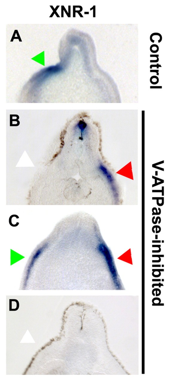 Fig. 2. In situ hybridization for XNr1 in untreated and concanamycin-treated Xenopus embryos. Treatment of Xenopus embryos with the H+-V-ATPase inhibitor concanamycin causes significant levels of heterotaxia that can be seen in the situs of organs at stage 45 (Fig. 1L), but disruptions of laterality can be detected much earlier by the expression patterns of normally left-sided markers. (A-D) Sectioned embryos processed for in situ hybridization with an XNr1 antisense probe. In wild-type embryos, XNr1 is restricted to the left (A); however, in inhibitor-treated embryos, its expression is randomized (B-D). Green arrows indicate normal position of staining; red arrows indicate ectopic expression domain; white arrows indicate lack of expression in normal region. Dorsal is upwards in all panels; left and right sides correspond to those of the reader. |