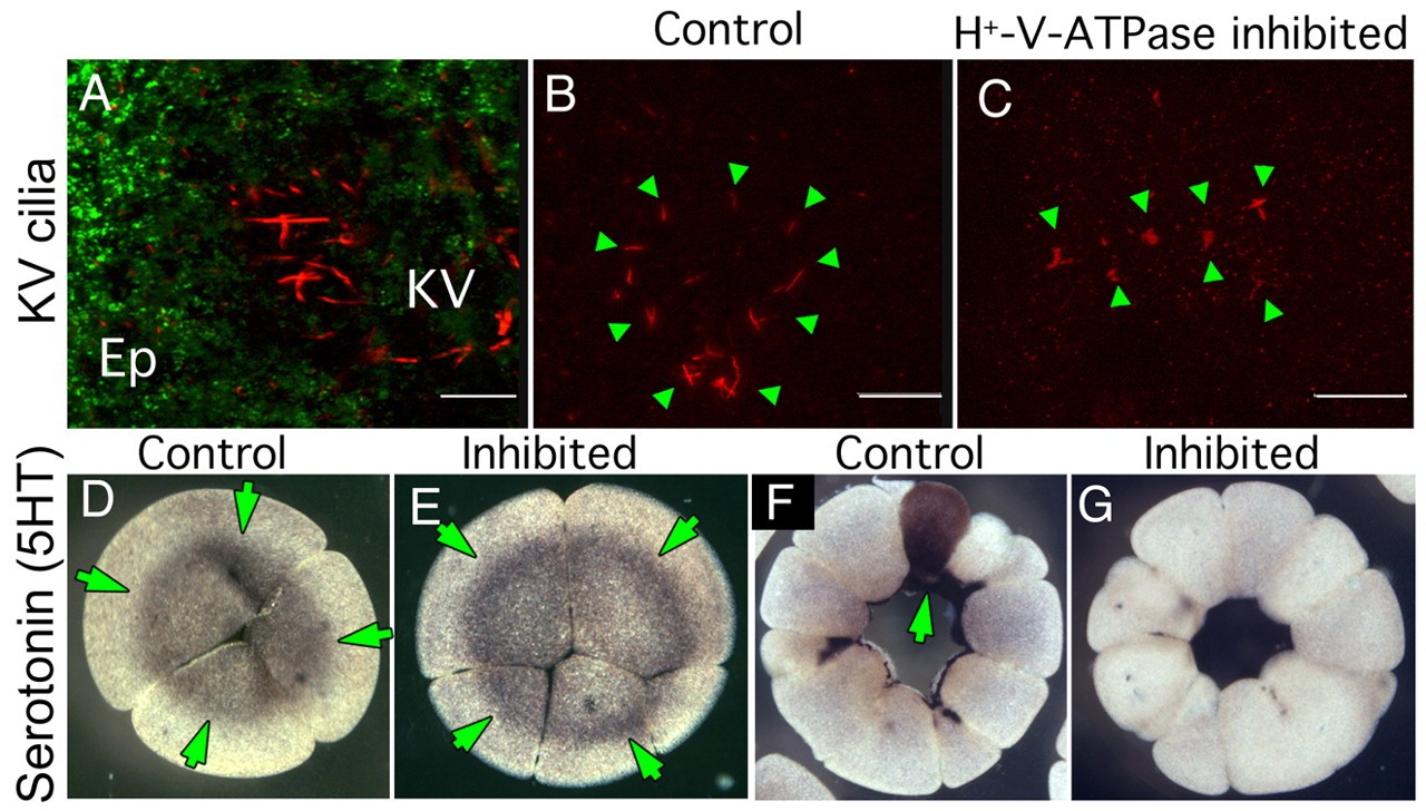 Fig. 8. Effect of early H+-V-ATPase inhibition on Kupffer's vesicle cilia and localization of serotonin. (A) Oblique confocal section through an 8-somite zebrafish larva doubly immunostained for H+-V-ATPase subunit A (green) and acetylated tubulin (red). Although subunit A is obvious in cells of the overlying epithelium (Ep), no H+-V-ATPase subunits are associated with KV cilia. (B,C) IHC for acetylated tubulin reveals the structure of KV cilia (green arrowheads) in five- to seven-somite stage zebrafish embryos. (B) Untreated embryo showing the characteristic circular field of long straight cilia, (C) KV cilia of five- to seven-somite embryos, soaked in H+-V-ATPase inhibitors from the one-cell to shield stage, are often reduced in number, altered in distribution or appear foreshortened relative to controls. (D,E) Immunohistochemistry for serotonin (5-HT, green arrows) in four-cell Xenopus embryos using an antibody previously shown to be specific for 5-HT (Levin, 2004); (D) untreated, (E) incubated in concanamycin from the one-cell stage. At this stage, there is no effect of H+-V-ATPase inhibition on 5HT localization (green arrows) or level. (F,G) Immunohistochemistry for 5HT in 32-cell Xenopus embryos; (F) normal pattern of 5HT staining in one cell in an untreated embryo (green arrows); (G) 5HT is absent from the H+-V-ATPase inhibited embryo. |