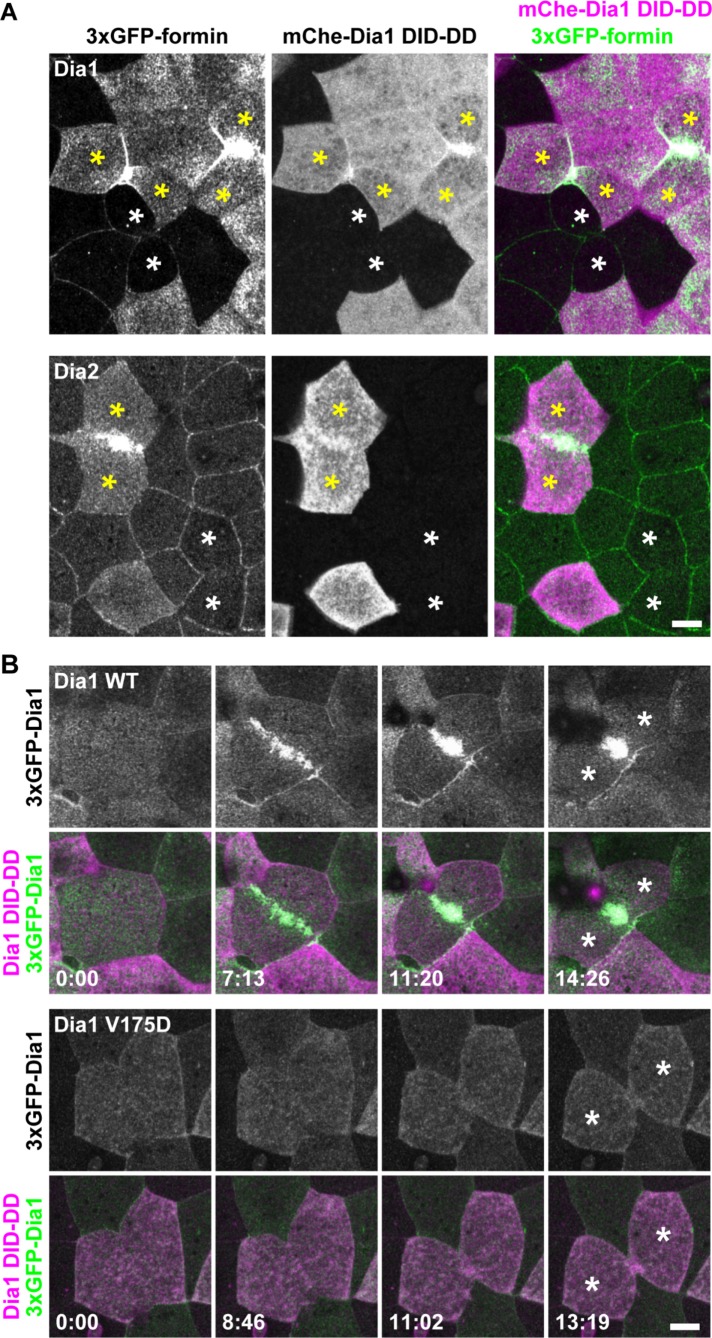Reorganization of the actin cytoskeleton is crucial for cellular processes, including cytokinesis and cell-cell junction remodeling. Formins are conserved processive actin-polymerizing machines that regulate actin dynamics by nucleating, elongating, and bundling linear actin filaments. Because the formin family is large, with at least 15 members in vertebrates, there have not been any comprehensive studies examining formin localization and function within a common cell type. Here, we characterized the localization of all 15 formins in epithelial cells of Xenopus laevis gastrula-stage embryos. Dia1 and Dia2 localized to tight junctions, while Fhod1 and Fhod3 localized to adherens junctions. Only Dia3 strongly localized at the cytokinetic contractile ring. The Diaphanous inhibitory domain-dimerization domain (DID-DD) region of Dia1 was sufficient for Dia1 localization, and overexpression of a Dia1 DID-DD fragment competitively removed Dia1 and Dia2 from cell-cell junctions. In Dia1 DID-DD-overexpressing cells, Dia1 and Dia2 were mislocalized to the contractile ring, and cells exhibited increased cytokinesis failure. This work provides a comprehensive analysis of the localization of all 15 vertebrate formins in epithelial cells and suggests that misregulated formin localization results in epithelial cytokinesis failure.