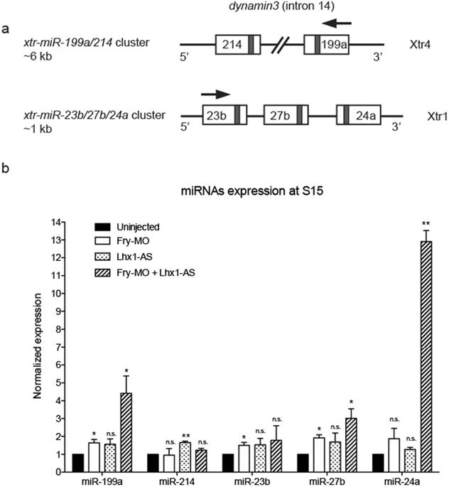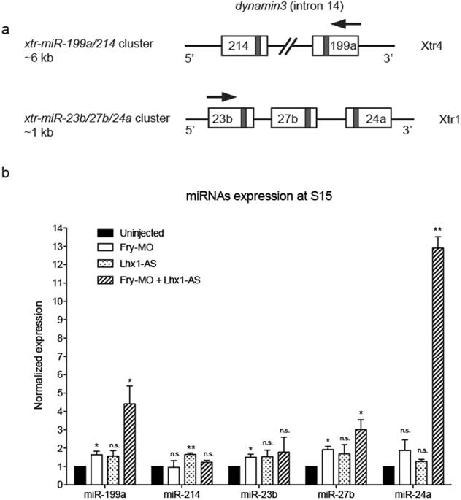 Figure 8. Validation of miRNA deep sequencing data by real-time qRT-PCR. (a) Schematic of the miR-199a/214 and miR-23b/27b/24a clusters in the X. tropicalis genome. The Xenopus tropicalis chromosome (Xtr) where each cluster is located is indicated. The miR-199a/214 cluster is located within intron 14 of the dynamin3 gene and has a length of ~6 kb while the miR-23b/27b/24a cluster is intergenic and has a length of ~1 kb. The grey colored rectangles indicate the position of the mature miRNAs within the pre-miRNA structures. Arrows indicate transcription direction. (b) Expression levels of miRs within the miR-199a/214 and miR-23b/27b/24a clusters were determined in Lhx1- and/or Fry-depleted embryos. 8-cell embryos were injected 2x V2 with 2.5 ng of Fry-MO and/or 50 pg of Lhx1-AS. Error bars indicate standard deviation derived from three repeats of the PCR reactions with different biological samples. Statistical significant differences were determined by a one-tailed paired t-test. n.s., non-significant; *pâ<â0.05; **pâ<â0.01.