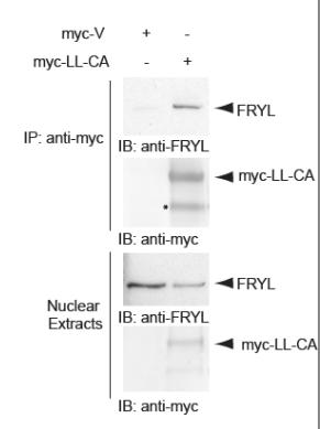 Supplementary Figure S1. Fry-like interacts with the constitutive active Ldb1-Lhx1 complex. Western blot analysis of total nuclear extracts or immunoprecipitated complexes of transfected HEK-293T cells. Cells were transfected either with myc-V or myc-LL-CA, immunoprecipitated (IP) with anti-myc antibody and blotted (IB) either with anti-myc or FRYL antibody. * This band might be a product of degradation of myc-LL- CA.