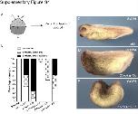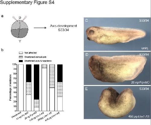 Supplementary Figure S4. Induction of axis development defects by depletion of Fry and Lhx1. (a) Representation of the experimental procedure. Both dorsal blastomeres of the 4-cell embryos were injected. (b) Percentage of embryos at S33/34 (stage 33/34) with a shortened axis and/or headless phenotype. Uninjected (N=3, 36), Fry-MO 10 ng (N=4, 110), Fry-MO 20 ng (N=6, 148), Lhx1-AS 100 pg (N=3, 59), Lhx1-AS 200 pg