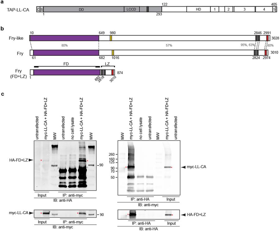 Figure 1. The functional domains of Fry directly interact with constitutive active Ldb1-Lhx1. (a) TAP-LL-CA protein contains a calmodulin binding peptide c, a streptavidin binding peptide s, dimerization domain (DD) of Ldb1 protein, Ldb1-Chip conservative domain (LCCD), nuclear localization signal (dark gray bar), Lhx1 homeodomain (HD), and Lhx1 C-terminal conserved regions (1–5). (b) Full-length Xenopus Fryl and Fry proteins. Furry domain (FD, purple bar), two leucine-zipper motifs (gray bars) and a coiled-coil structure (red bar). The percentage of sequence similarity between different regions of these proteins is indicated. The FD + LZ domain fusion version of Fry contains the N-terminal FD domain and C-terminal domains (LZ). The aminoacid numbers of the original protein are indicated. (c) Western blot analysis of immunoprecipitated complexes of transfected HEK-293T cells. Cells were co-transfected with myc-LL-CA and HA-FD + LZ, immunoprecipitated (IP) and blotted (IB) as indicated. IP of untransfected cells and without cell lysate were used as controls for the assay. The red asterisks indicate the bands of interest.
