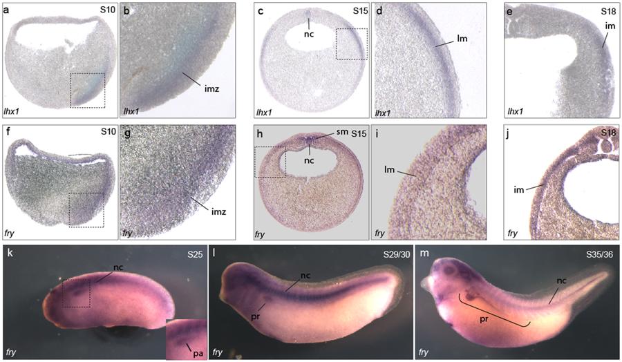 Figure 2. Fry is co-expressed with lhx1 in the intermediate mesoderm and pronephric kidney of Xenopus embryos. (aâm) Fry and lhx1 expression in Xenopus embryos. (a) Crossed section of a S10 embryo stained for lhx1. (b) Magnification of the region marked in a. (c,d) Transverse section of a S15 embryo with lhx1. (d) Magnification of the area marked in c. (e) Expression of lhx1 in a S18 embryo. (f) Crossed section of a S10 embryo stained for fry. (g) Magnification of the area marked in f. (h,i) Expression of fry in S15 embryos. (h) Transverse section. (i) Magnification of the marked area in h. (j) Expression of fry in a S18 embryo. (kâm) Expression of fry in tadpole stages. Involuting marginal zone (imz), lateral mesoderm (lm), pronephric anlage (pa), intermediate mesoderm (im), notochord (nc), somitic mesoderm (sm), pronephros (pr). Representative embryos are shown.