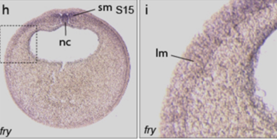 fry (FRY microtubule binding protein) gene expression in Xenopus laevis embryo, assayed via in situ hybridization, transverse section, NF stage 15, dorsal up.