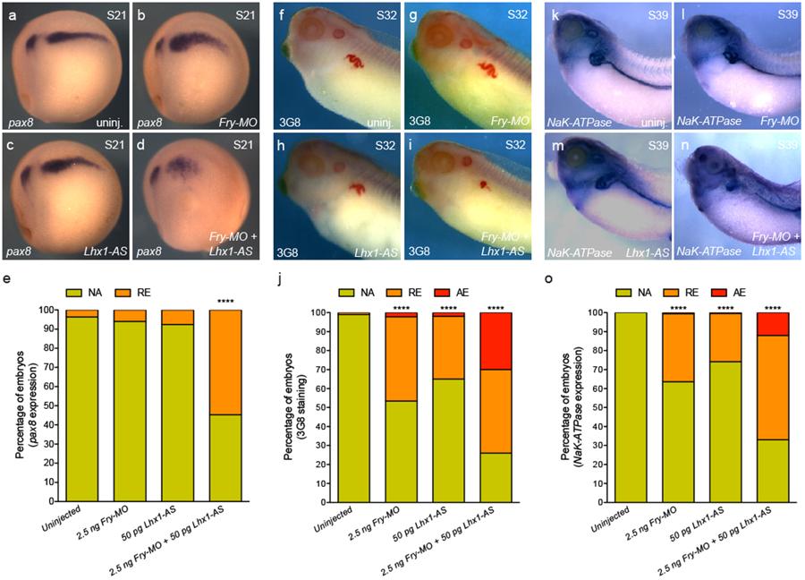Figure 5. Synergistic interaction of Fry and Lhx1 to pattern the kidney field. (aâd) Pax8 expression in S21 (stage 21) embryos, lateral views. (e) Percentage of S21 embryos with abnormal pax8 expression under different treatments. Uninjected (Nâ=â3, 41), Fry-MO (Nâ=â3, 56), Lhx1-AS (Nâ=â3, 65), Fry-MOâ+âLhx1-AS (Nâ=â3, 75) (Nâ=ânumber of experiments, number of embryos). (fâi) 3G8 immunostaining of S32 (stage 32) embryos. (j) Percentage of S32 embryos with reduced or absent 3G8 staining. Uninjected (Nâ=â3, 122), Fry-MO (Nâ=â3, 88), Lhx1-AS (Nâ=â3, 79), Fry-MOâ+âLhx1-AS (Nâ=â3, 81). (kân) β1-NaK-ATPase expression in S39 (stage 39) embryos. (o) Percentage of embryos with abnormal β1-NaK-ATPase expression. Uninjected (Nâ=â6, 168), Fry-MO (Nâ=â6, 165), Lhx1-AS (Nâ=â6, 193), Fry-MOâ+âLhx1-AS (Nâ=â6, 183). Reduced (RE), absent (AE) or not affected (NA) expression/staining. 8-cell embryos were injected 1x V2 with 2.5 ng of Fry-MO and/or 50 pg of Lhx1-AS. Representative embryos are shown. Data in the graphs is presented as means. Statistical significance was evaluated using Fisherâs exact test ****pâ<â0.0001.