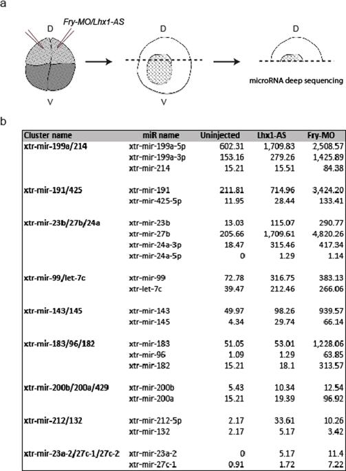 Figure 7. miRNA deep sequencing of Fry- and Lhx1-depleted embryos. (a) Experimental procedure followed to generate the samples for miRNA deep sequencing. Both dorsal blastomeres of 4-cell embryos were injected. Dorsal halves were isolated and processed for miRNA deep sequencing. (b) Selected nine miRNA clusters with increased levels of their respective miRs upon either lhx1 or fry depletion. The values are the normalized number of counts for each miR.