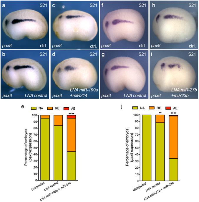 Figure 9. Overexpression of miR-199a/214 and miR-23b/27b reduce the kidney field size. (aâi) Pax8 expression in S21 (stage 21) embryos injected with LNA mimics. (a,b,f and g) Injected with LNA control. (a,f) Uninjected side (ctrl). (b,g) Injected side with LNA control. (c,d) Embryo injected with LNA miR-199aâ+âmiR214. Uninjected (c) and injected (d) sides of the same embryo. (h,i) Embryos injected with LNA miR-27bâ+âmiR23b. Uninjected (h) and injected (i) sides of the same embryo. (e) Percentage of embryos with abnormal pax8 expression field. Uninjected (Nâ=â3, 63); LNA ctrl. (Nâ=â3, 64); LNA miR-199aâ+âmiR-214 (Nâ=â3, 76, 49% reduced or absent expression) (Nâ=ânumber of experiments, number of embryos, % of affected embryos). (j) Percentage of embryos with abnormal pax8 expression field. Uninjected (Nâ=â3, 66); LNA ctrl. (Nâ=â3, 65); LNA miR-27bâ+âmiR-23b (Nâ=â3, 59, 64% reduced or absent expression). Reduced (RE), absent (AE) or not affected (NA) field of expression. Data in graphs is presented as means. ****pâ<â0.0001, **pâ<â0.01 Fisherâs exact test