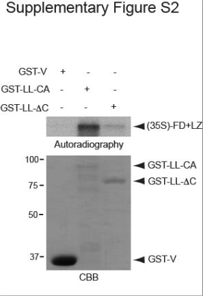 Supplementary Figure S2. In vitro binding assay of the indicated GST-fusion proteins with in vitro translated FD+LZ (35S)methionine of Fry. TAP-LL-∆C lacks the C-terminal conserved regions 2-5 of Lhx1. Coomassie brilliant blue (CBB) staining is shown as input control for the GST-fusion proteins.