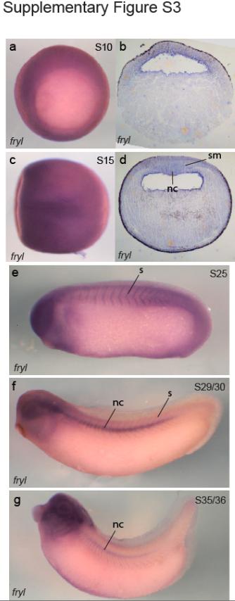 Supplementary Figure S3. Fryl expression in Xenopus embryos. (a, c) Expression of fryl in S10 (stage 10) and S15 embryos (stage 15). (b, d) Crossed section of S10 and S15 embryos stained for fryl. (e-g) Expression of fryl in late neurula S25 and tailbud stages S29/30 and S35/36. Notochord (nc) and somites (s).