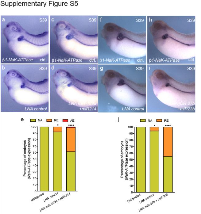 Supplementary Figure. S5. Overexpression of miR-199a/214 and miR-23b/27b reduce the kidney field size. (a-d, f-i) β1-NaK-ATPase expression in S21 (stage 21) embryos injected with LNA mimics. (a, b, f and g) Embryos injected with LNA control. (a and f) Uninjected side (ctrl). (b and g) Injected side with LNA control. (c and d) Injected side with LNA miR-199a + miR-214. Uninjected (c) and injected (d) sides of the same embryo. (h and i) Embryos injected with LNA miR-27b + miR-23b. Uninjected (h) and injected (i) sides of the same embryo. (e) Percentage of embryos with abnormal β1- NaK-ATPase expression. Uninjected (N=3, 70); LNA ctrl. (N=3, 74); LNA miR-199a + miR-214 (N=3, 92, 39% reduced or absent expression). (j) Percentage of embryos with abnormal β1-NaK-ATPase expression. Uninjected (N=3, 96); LNA ctrl. (N=3, 66); LNA miR-27b + miR-23b (N=3, 63, 46% reduced or absent expression). Reduced (RE), absent (AE) or not affected (NA) field of expression. Data in graphs is presented as means. **** p<0.0001, * p<0.05 Fisherâs exact test.
