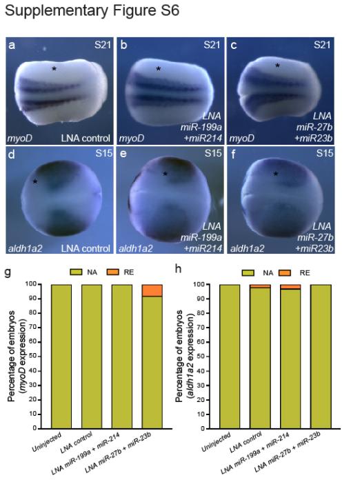 Supplementary Figure S6. Overexpression of miR-199a/214 and miR-23b/27b within a V2 blastomere have no significant effects on myoD and aldh1a2 expression. (a-c) In situ hybridization of S21 (stage 21) embryos for myoD. Asterisk indicates the injected side of the embryo. (d-f) In situ hybridization of S15 (stage 15) embryos for aldh1a2. (g) Percentage of embryo with reduced (RE) or not affected (NA) myoD expression. Uninjected (N=2, 50); LNA ctrl. (N=2, 40); LNA miR-199a + miR-214 (N=2, 52); LNA