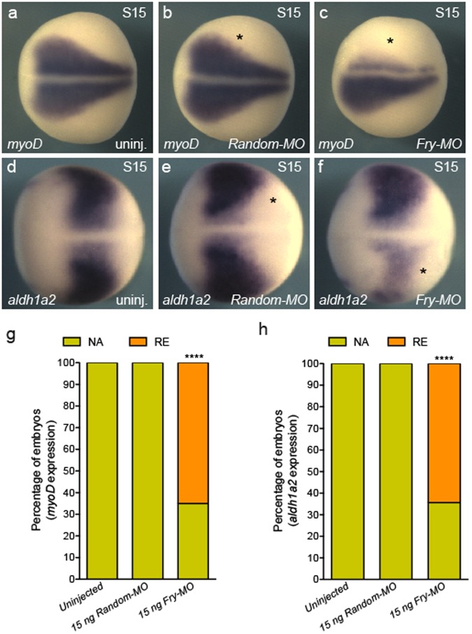 Figure 4. Expression of paraxial mesoderm marker genes is reduced in Fry-depleted embryos. (aâc) In situ hybridization of S15 (stage 15) embryos for myoD. (g) Percentage of embryos with reduced (RE) or not affected (NA) myoD expression field revealed by in situ hybridization. Uninjected (Nâ=â3, 92), Random-MO (Nâ=â2, 36), Fry-MO (Nâ=â4, 85). (dâf) In situ hybridization of S15 embryos for aldh1a2. (h) Percentage of embryos with reduced (RE) or not affected (NA) aldh1a2 expression field revealed by in situ hybridization. Uninjected (Nâ=â3, 75), Random-MO (Nâ=â2, 36), Fry-MO (Nâ=â3, 76) (Nâ=ânumber of experiments, number of embryos). As indicated on each panel, 8-cell embryos were injected 1x V2 with 15 ng of the MOs or left uninjected. Asterisk indicates the injected side of the embryo. Representative embryos are shown. Data in graphs is presented as means. Statistical significance was evaluated using Fisherâs exact test ***pâ<â0.0001.