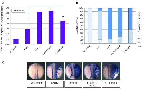 Figure 3. . Differential activity between mAscl1 and xAscl1 maps to the N terminus of the protein.Two cell stage embryos were unilaterally injected with 100pg of mRNA encoding each construct, as labelled. At stage 18, embryos were assayed for expression of N-β-tubulin relative to uninjected control embryos. (