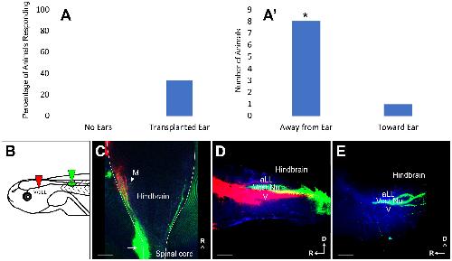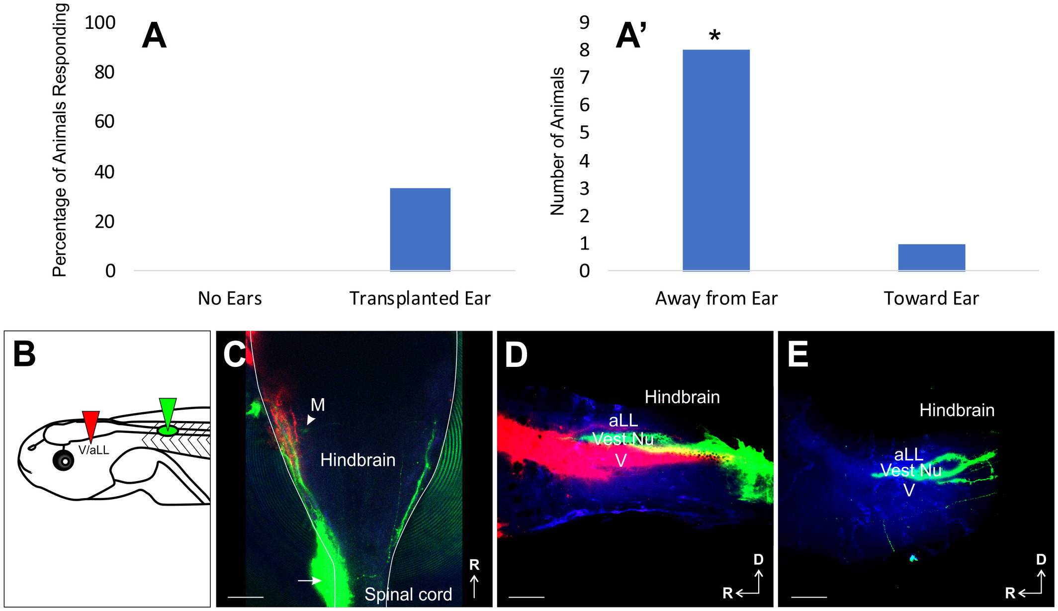 figure 4. C‐start startle response by transplanted ears. (A) Percentage of animals that displayed a C‐start startle response following stimulation in control animals with no ears and in animals in which the only ear was the transplanted ear adjacent to the spinal cord. (A′) Direction in each trial with a positive response observed in A from animals in which the only ear was the transplanted ear adjacent to the spinal cord. *P < 0.05, Chi‐Square analysis. (B) Schematic of dye placement. (C) Whole‐mount of a hindbrain from an animal that had a response in all four trials, three were in the direction away from the transplanted ear and one in the direction toward the transplanted ear. Arrow designates entry point of transplanted inner ear afferents. M, Mauthner cell. (D) Lateral view of ipsilateral hemisected hindbrain showing projections of transplanted ear afferents (green) in between anterior lateral line (aLL) and trigeminal (V) afferent central projections (red). (E) Lateral view of contralateral hemisected hindbrain showing projections of a transplanted ear afferents (green) in between the region where the anterior lateral line (aLL) and trigeminal (V) nuclei are located. Autofluorescence is in blue. Scale bars are 100 µm.