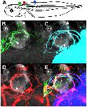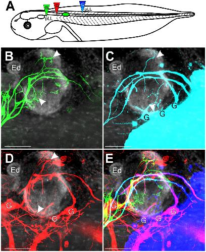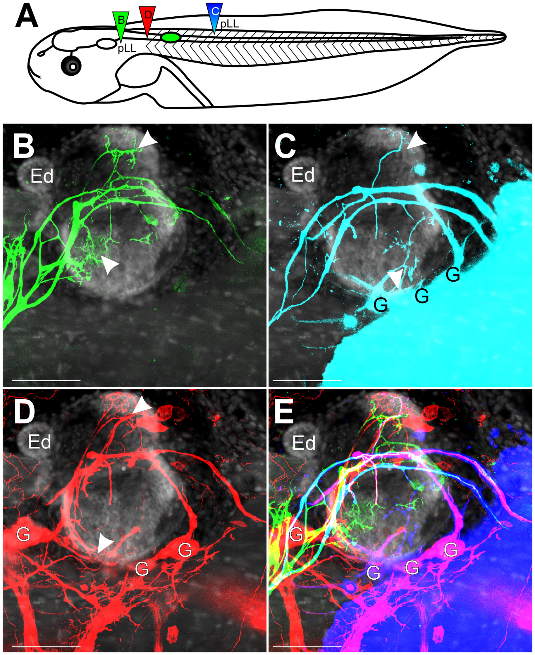 Figure 6. Inner Ear Afferent Fasciculation with Lateral Line. (A) Schematic of dye placement for the different transplants. (B) Lateral view of afferents of the pLL projecting over and into the ear (green, dye injection B in panel A). The ear was transplanted adjacent to the spinal cord at stage 32–36. No ganglia were labeled. (C) Lateral view of pLL and inner ear afferents from a caudal dye injection into caudal portion of the pLL nerve (cyan, dye injection C in panel A). G, ganglia. (D) Lateral view of inner ear afferents from a spinal cord injection rostral to the transplanted ear (red, dye injection D in panel A) G, ganglia. (E) Merge of B‐D. Cyan of panel C has been replaced by blue. Panels B–E are counterstained for nuclei marker Hoechst (gray). Arrowheads indicate areas of innervation of the inner ear. Scale bars are 100 µm Endolymphatic duct, Ed.