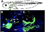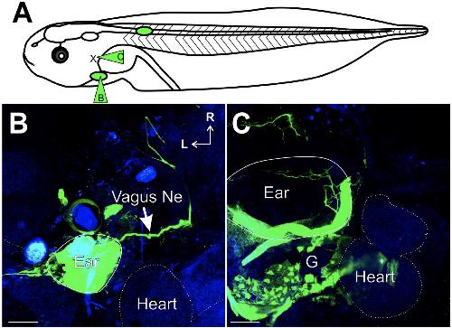 Figure 7. Inner ear afferent fasciculation with the vagus nerve. (A) Schematic of ear transplants showing dye placement for the ears transplanted adjacent to the heart. (B) Ventral view of an animal with an ear transplanted into the heart region showing ear afferents projecting with the vagus nerve (green, dye injection B in panel A; Vagus Ne, arrow). Heart is outlined with a dotted line as determined from autofluorescence background (blue). (C) Ventral view of an animal with an ear transplanted next to the heart. Labeling (green) from dye injection into the vagus nerve (dye injection C in panel A) showing innervation of the ear and labeling of inner ear ganglia. Autofluorescense background (blue). Scale bars are 100 µm Rostral, R; Lateral, L.