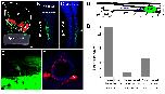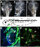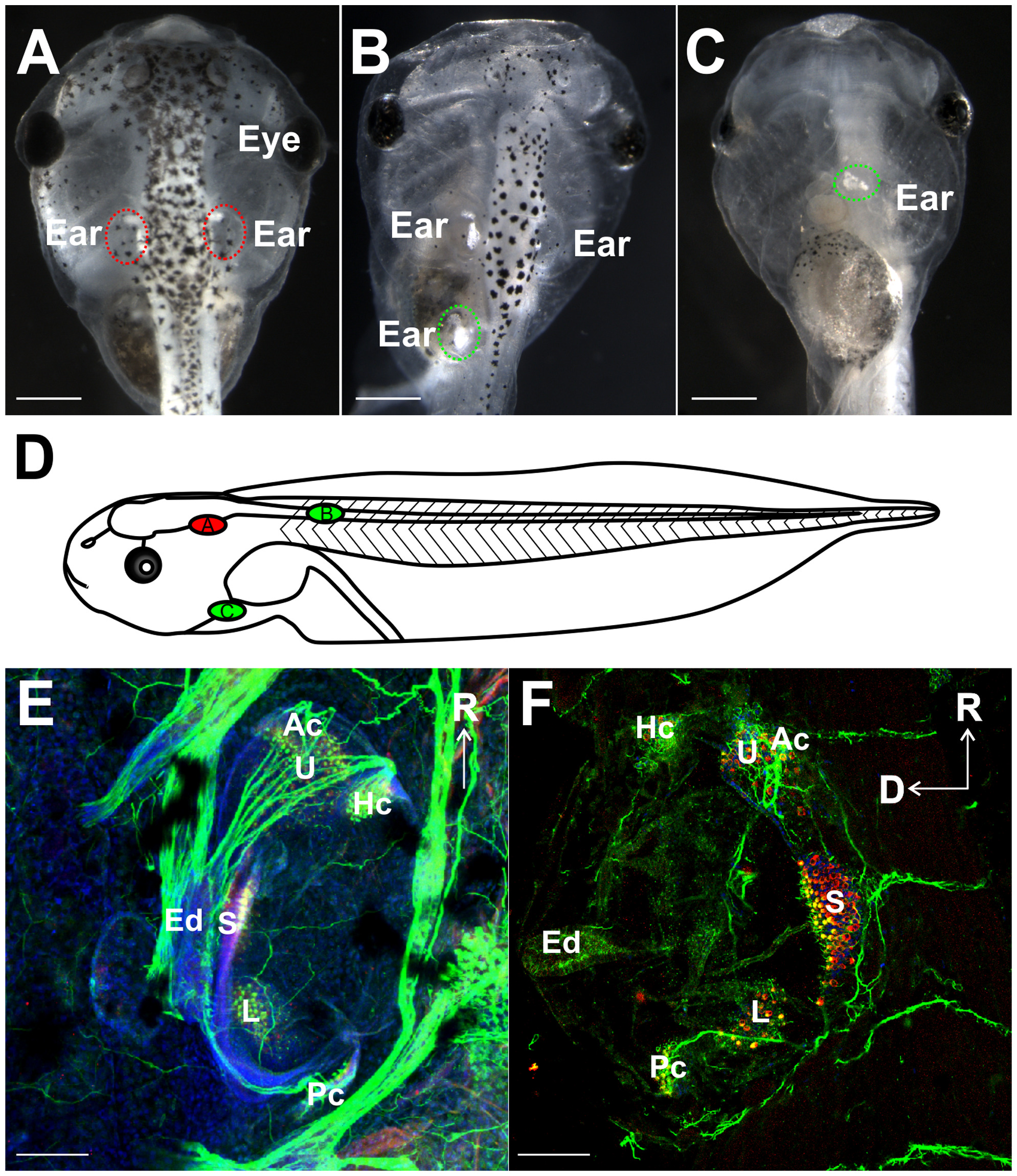 Figure 1. Evaluation of ear transplantations (A–D) Stage 46 X. laevis embryos showing positions of native ears and transplanted ears (circled). (A) Control animal. (B) Embryo with a third ear transplanted adjacent to the spinal cord. (C) Ventral view of embryo with a third ear transplanted next to the heart. (D) Schematic diagram representing a lateral view of stage 46 X. laevis demonstrating the positions of the native ear (red, A) and the two different transplantations (green, B,C). (E) Control ear and (F) a transplanted ear labeled with antibodies against MyoVI (red) and tubulin (green) demonstrating the presence of hair cells in six distinct epithelia along with Hoechst nuclei counterstain (blue) (Utricle, U; Saccule, S; Lagena, L; Anterior canal, Ac; Horizontal canal, Hc; Posterior canal, Pc) and neurons, respectively. Endolymphatic duct is labeled Ed. Scale bars in A–C are 0.5 mm and 100 µm in E–F Rostral, R; Dorsal, D.
