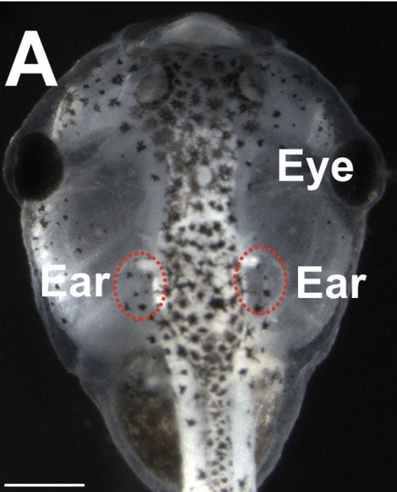 Head of a X. laevis embryo, at NF stage 46 , showing position of eyes and otic vesicles (i.e, auditory apparatus or ears), dorsal veiw, anterior up. Scale bar = 0.5cm