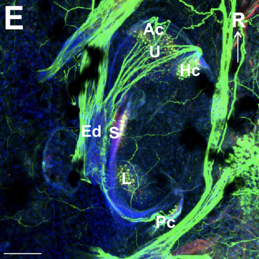 Key: utricle, U; sacculus, S; lagena, L; anterior canal, Ac; Horizontal [lateral] semicircular canal, Hc; Posterior canal, Pc, Endolymphatic duct Ed. Scale bar = 100 µm.