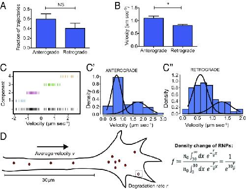 Fig. 6. Directional differences in β-actin mRNA-directed transport along the axon shaft are sufficient to confer localization patterns. (A) No significant difference (NS) was found in the frequency of anterograde- versus retrograde-directed transport of β-actin mRNA in axons. (B) A comparison of the velocity of anterograde- and retrograde-directed transport states shows that β-actin mRNA moves significantly faster in the anterograde direction. (C) Multimixture modeling of Gaussian modal distributions of directed transport speeds best fits a quadmodal distribution in which velocities exhibit a bimodal distribution in the anterograde (Câ²) and retrograde (Câ²â²) directions. (D) A mathematical model shows that fold change in density resulting from an anterograde bias in directed transport speeds is sufficient to predict enriched β-actin mRNA density in the central domain of the growth cone. *P = 0.0167; MannâWhitney U test; n = 124 puncta, and n =66 axons. |